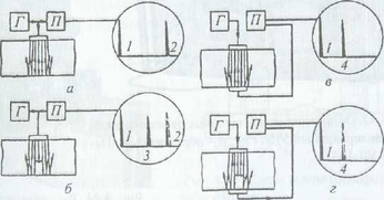 Рис 4.42. Схема ультразвукового контроля эхо-импульсным (а, 6) и теневым (в, г) методами при отсутствии (а, в) и наличии (б, г) дефекта