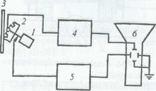 1 - электродвигатель; 2 - блок головок; 5 - магнитная лента; 4 - усилитель; 5 - генератор развёртки; б-электронно-лучевая трубка