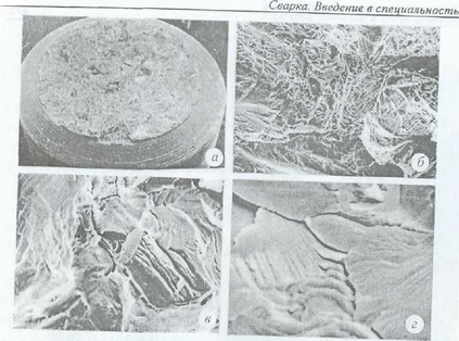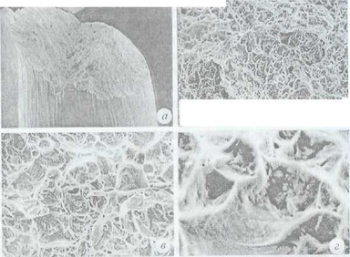 Рис. 4.61. Топография поверхности разрушения образца из основного металла: а ~ х20; б - х500; в - Х2000; г - х 10000