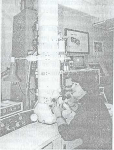 При необходимости большего увеличения пользуются электронными микроскопами (рис. 4.60), которые обеспечивают увеличение до 200000 раз. Эти микроскопы работают по схеме проходящих электронных лучей. Вместо стеклянных линз в электронном микроскопе установлены электромагнитные линзы, преломляющие электронные лучи. Источником электронов служит раскалённая вольфрамовая нить.