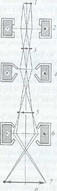 1 - источник электронов; 2 - кондедсорная линза; 3 - объект; 4 - объективная линза; 5 - промежуточное изображение; б - проекционная линза; 7 -конечное изображение