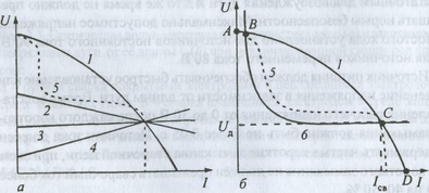 ис. 3.4. Внешние характеристики источников сварочного тока (а) и соотношение характеристик дуги и падающей характеристики сварочного тока при сварке (б)