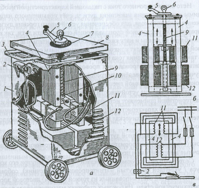 а - внешний вид; б - схема регулирования сварочного тока; в - электрическая схема; / - корпус; 2 - зажим; 3 - ручка; 4 _ магнитопровод; 5- рукоятка; 6 - рым-болт; 7 - шкала; 8 - крышка корпуса; 9 - вертикальный винт; 10 -ходовая гайка винта; 11,12 - вторичная и первичная обмотки соответственно