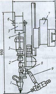 1 - горелка; 2 - механизм подачи; 3 -привод; 4 - подвеска; 5 - кассета; 6 -тормозное устройство; 7 – суппорт двухкоординатный; 8 - коррекгор; 9 -подвеска