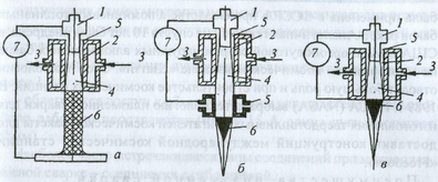 а - плазменной дуги; б, в - плазменной струи; / - электрод; 2 - канал; З'-охлаждающая вода; 4 - столб дуги; 5 - сопло; 6 - плазменная струя; 7 -источник тока