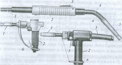 Рис. 3.23. Сварочные горелки для полуавтоматической сварки: а - для механизмов подачи толкающего типа; б - с встроеннымв рукоятку механизмом тянущего типа; в - с комбинрованным механизмом подачи толкающе-тянущего типа; 1 - шланг; 2 - рукоятка; 3 - кнопка управления; 4 - направляющая; 5 - сопло