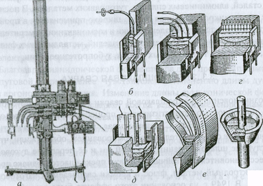 ис. 3.25. Трёхэлектродная установка У112-ЕТ2-450 (а) и основные схемы процессов электрошлаковой сварки (б-ж):