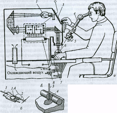 Рис. 3.32. Установка для свар-ки лазером (а) и схема образо-вания соединения при лазерной сварке (б); а: 1 - осветитель (фокусировка луча по месту сварки); 2 - рубин (активное вещество); 3 - пульт управления- 4 - микроскоп; 5 - шторка; 6 - свариваемые детали; 7 - манипулятор