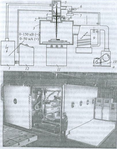 Рис. 3.31. Принципиальная схема (а) и общий вид установки для электронно-лучевой сварки (6):