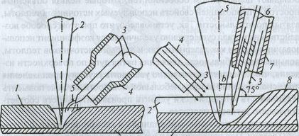 Рис. 3.33. Схема процессов лазерно-дуговой сварки: а-при использовании дуги с неплавящимсяэлектродом [/ -шов; 2-лазер-ный пучок; 3 - неплавящийся электрод; 4 - сопло; 5 - дуга; 6~ изделие]; б-при использовании дуги, горящей на плавящемся электроде [/ - изделие; 2 - разделка шва; 3 ~ защитный газ; 4 и 7 - сопла; 5 - лазерный пучок; 6 -электродная проволока; 8 - шов; Ь - расстояние между источниками теплоты]