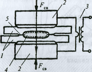 Свариваемые детали 1 (рис. 3.35) собирают внахлёстку и зажима-ют усилием Рп между двумя электродами 2, подводящими ток боль-шой силы (до нескольких десятков кА) к месту сварки от источника электрической энергии 3 невысокого напряжения (обычно 3-8 В).