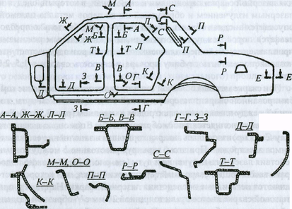 Рис. 3.34. Схема нахлёсточных соединений боковины кузова легкового ав-томобиля