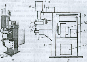 Рис. 3.36. Общий вид машины точечной сварки (а) и её основные узлы (б)