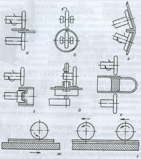 Разнообразные виды шовной сварки, встречаемые на практике, в основном различаются способом подвода сварочного тока (односторонний или двусторонний) и расположением роликов относительно свариваемых деталей (рис. 3.38). Двусторонняя шовная сварка аналогична двусторонней точечной (рис. 3.38, а-е). Вместо одного из роликов может быть применена оправка, плотно контактирующая с внутренней деталью (рис. 3.38, г). Дпя сварки неподвижных дета-лей кольцевым швом на плоскости служит верхний ролик, который вращается вокруг своей оси, а также вокруг оси шва (рис. 3.38, д).