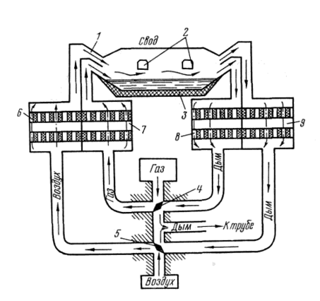Газ и воздух проходят через предворительно разогретые до t около 1200 градусов камеры-регенераторы 6 и 7 , выложенные изнутри огнеупорным кирпичом , где нагреваются до t 800-900 градусов . При сжигании разогретого газа в атмосфере разогретого воздуха в горелке 1 образуется пламя , поднимающее температуру в рабочем пространстве печи до 1700 градусов и выше . Твёрдые шихтовые материалы , загружаемые через окна 2 плавятся на поду 3 . Продукты сгорания при температуре около 1600 градусов поступают в камеры 8 и 9 и разогревают керамическую кладку до 1200 градусов , после чего уходят в дымовую трубу . К этому времени камеры 6 и 7 уже охладились, отдав тепло нагреваемым газу и воздуху . Поэтому , изменяя положение клапанов 4 и 5 , направление движения газа и воздуха меняется , и они поступают в камеры 8 и 9 , разогретые отходящими газами . Этот процесс повторяется в течение всей плавки . В современных печах перекидка производится автоматически , в зависимости от температуры регенераторов . Футуровка печи выполняется из кислых (Окись кремния SiO2 и динасовый кирпич) и основных (магнезит и доломит , состоящие в основном из MgO и CaO ) огнеупорных материалов. В печах с основной футуровкой плавка ведётся под слоем жидкого шлака , содержащего до 60% CaO . Такой шлак позволяет удалить из расплавленной стали значительную часть вредных примесей – серы и фосфора .