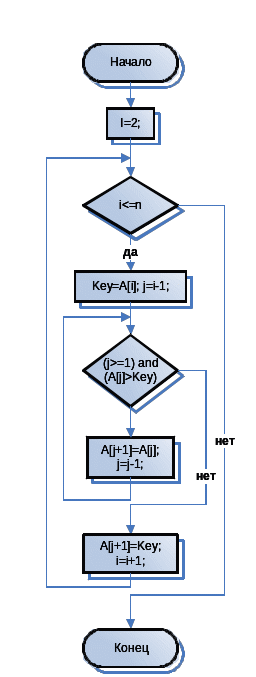 Пусть отсортировано начало массива A[1], A[2], ..., A[i-1], а остаток массива A[i], ...,A[n] содержит неотсортированную часть. На очередном шаге будем включать элемент A[i] в отсортированную часть, ставя его на соответствующее место. При этом придется сдвинуть часть элементов, больших A[i], (если таковые есть) на одну позицию правее, чтобы освободить место для элемента A[i]. Но при сдвиге будет потеряно само значение A[i], поскольку в эту позицию запишется первый (самый правый – с самым большим индексом) сдвигаемый элемент. Поэтому прежде чем производить сдвиг элементов необходимо сохранить значение A[i] в промежуточной переменной. Так как массив из одного элемента можно считать отсортированным, начнем с i=2.