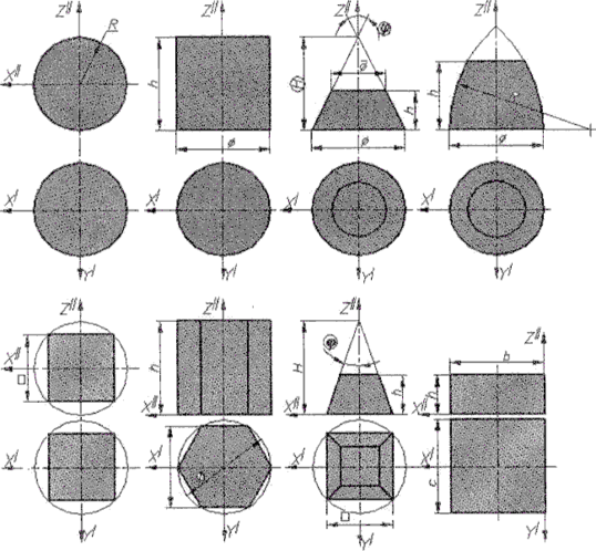 Распознать по изображению структуру заданного составного геометрического тела - это, значит, определить форму и количество тел-примитивов, составляющих заданное составное геометрическое тело. Тела-примитивы – это, как правило, тела, ограниченные простейшими алгебраическими поверхностями первого и второго порядков: плоскостями, конусами, цилиндрами, сферами, и т. д., или их частями (см. рис. 2).