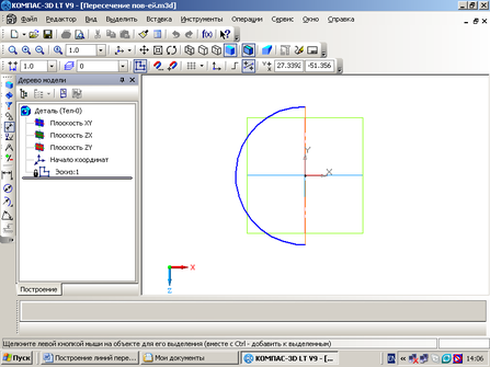 Полусферу будем моделировать с помощью операции вращения. Построим эскиз половины окружности и ось вокруг, которой она должна вращаться. В программе Компас-3D существуют определенные требования к эскизу для моделирования тела операцией вращения: