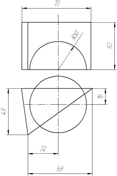 Проанализировав комплексный чертёж распознаём следующие поверхности: полусфера с радиусом 30 мм. и трёхгранная проецирующая призма.