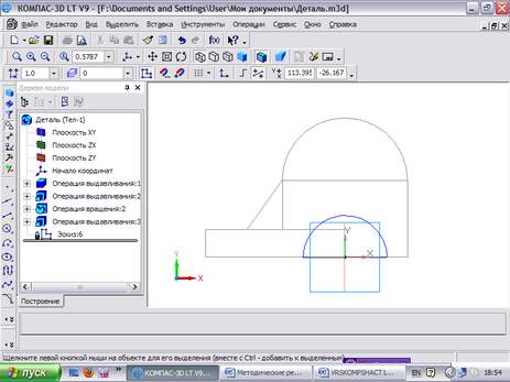 Построим половину окружности. Команды - Инструменты│Геометрия│Дуги│Дуга. Указываем центр дуги (перед этим не забудьте поменять стиль линии на Основной), потом точку начало дуги и конечную точку. Рис.10