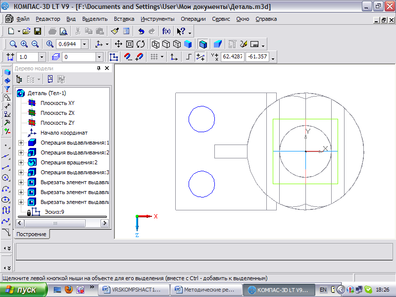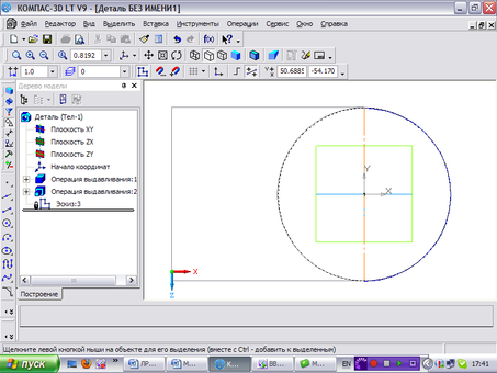 Проведем осевую линию. Команды - Инструменты│Геометрия│Отрезки│Отрезок. Внизу на панели свойств в окне Стиль устанавливаем стиль линии Осевая. Указываем первую точку прямой на окружности и вторую точку, так чтобы прямая проходила через центр окружности.