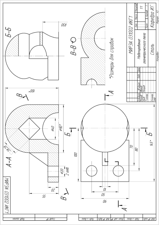Количество изображений в задании определено. Это три основных вида, и вынесенное сечение заданной проецирующей наклонной плоскостью. Для выделения формы внутреннего контура предмета необходимо выполнить на главном изображении сложный фронтальный ступенчатый или ломаный разрез. На изображении слева, как правило, выполняется простой профильный разрез, либо вид слева, совмещенный с простым профильным разрезом. (В конкретном примере выполняется фронтальный ступенчатый разрез, а на виде слева, совмещенный с профильным видом простой профильный разрез.) Компоновка изображений геометрического тела обеспечивает их рациональное размещение на поле формата для нанесения размеров и обозначений рис. 22. На чертеже показываются во взаимной проекционной связи три изображения (разрез на месте главного вида, разрез, на месте вида слева, совмещённый с видом, и вид сверху), а в правом нижнем углу над основной надписью располагается вынесенное сечение. При построении изображения вынесенного сечения геометрического тела допускается применять также другие преобразования, позволяющие рационально разместить
