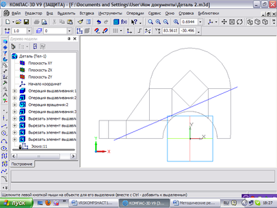 Обозначим плоскость сечения. Для этого проведем вспомогательную линию в соответствии с заданием. Команды - Инструменты│Обозначения│Линия разреза. Указываем начальную и конечную точки разреза. Esc. Удалим вспомогательную линию.