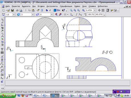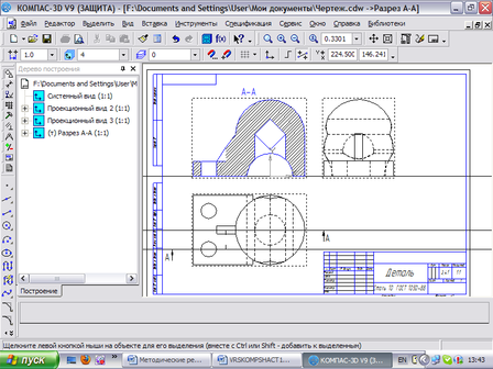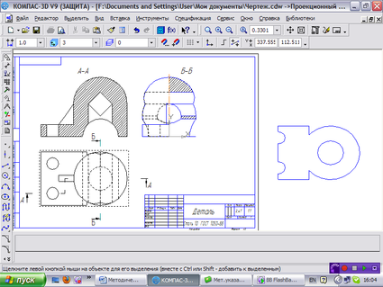 Выделим сечение рамкой и копируем в буфер. Команды - Редактор│Копировать. Появляется локальная система координат. Указываем положение базовой точки (например, центр отверстия) и открываем чертеж предмета.