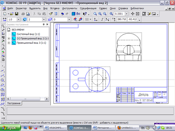 На месте «вида спереди» должен быть ступенчатый разрез, поэтому этот вид удаляем. В дереве построений правой кнопкой мыши выделяем Спереди →Удалить вид→ОК. Делаем текущим вид сверху. Выделяем правой кнопкой мыши Проекционной вид 2→Текущий. Вид меняет цвет на синий.