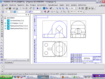. Esc. Поменяем стиль линии, отделяющую вид от разреза, на осевую. Для этого нажимаем правой кнопкой на Проекционный вид 3→Разрушить вид. Удаляем сплошную прямую и рисуем осевую линию. Удаляем вспомогательные линии. Рис. 29.
