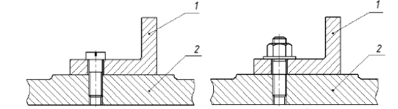 При соединении деталей винтами и шпильками гладкое сквозное отверстие выполняется в притягиваемой детали 1. В сопряженной с ней детали, участвующей в данном соединении, выполняется резьбовое отверстие (рис.2) с соответствующим конструктивным исполнением, например, с отверстием под головку винта. Эти конструктивные элементы называют опорными поверхностями.