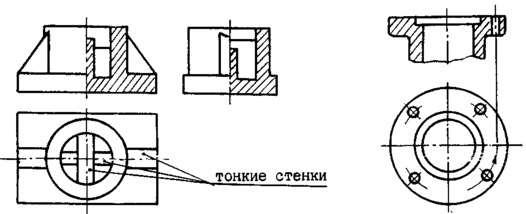 1. Тонкие стенки типа ребер жесткости (их поперечный размер значительно меньше двух других) в продольном разрезе показывают рассеченными, но не штрихуют, отделяя от основной части предмета сплошной основной линией (это не применяется в аксонометрии!).