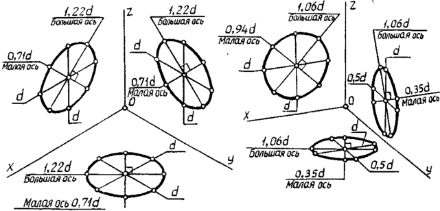 Построение эллипса начинают с определения его центра и направления большой и малой осей. Затем находят концы большой и малой осей (по приведенным ниже формулам) и четыре точки, являющиеся концами диаметров, параллельных аксонометрическим осям (проецируются без искажения). Как правило, полученных восьми точек достаточно для вычерчивания эллипса. Его обводят сначала от руки, а затем по лекалу.