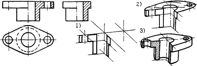Для выявления внутренней формы в аксонометрии делают вырез одной четверти предмета, ближайшей к наблюдателю. В этом случае вычерчивание можно начать с контуров сечения, как показано ниже.