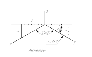 Построение начинают с аксонометрического изображения основных осей фигуры.