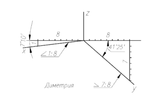 Для упрощения аксонометрию строят по приведенным коэффициентам, т.е. в изометрии по всем осям принимают коэффициент искажения равным 1, в диметрии по осям X и Z-1, по оси Y - 0,5. При этом изображение получается увеличенным в изометрии в 1/0,82 =1,22 раза и в диметрии - в 1/0,94 = 1,06 раза.