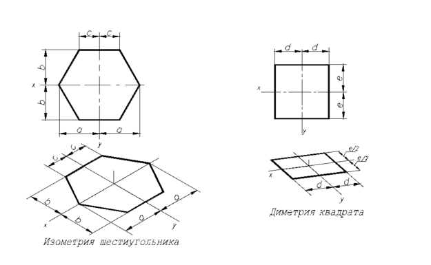 Следует избегать применения изометрической проекции при изображении квадрата, деталей с квадратными гранями, отверстиями и т.п., так как такое изображение не обладает наглядностью.