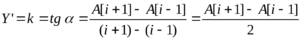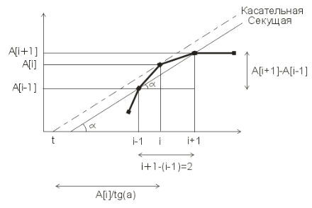 Далее ищется максимальная производная на всем периоде с помощью функции Max (см. пункт 1.5). Абсцисса точки начала выброса определяется через тангенс угла. Чтобы компенсировать сдвиг между секущей и касательной (они параллельны), в формулу будет подставляться координата точки i.