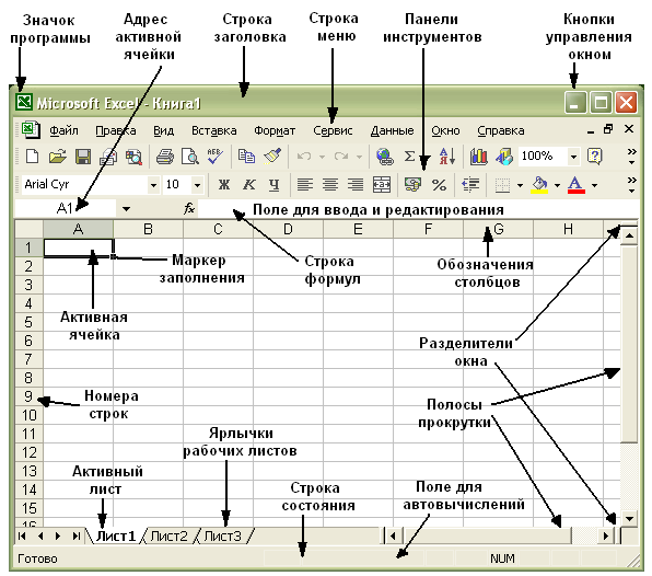 Строка заголовка содержит название приложения (в данном случае – это Microsoft Excel), имя открытого документа (Книга1.xls), кнопку системного меню (в левом верхнем углу окна – на рис. назван Значок программы), стандартные кнопки управления окном (в правом верхнем углу окна – на рис. названы Кнопки управления окном; кнопки управления окном (свернуть, развернуть, восстановить, закрыть) используются для изменения размера или закрытия активного окна).