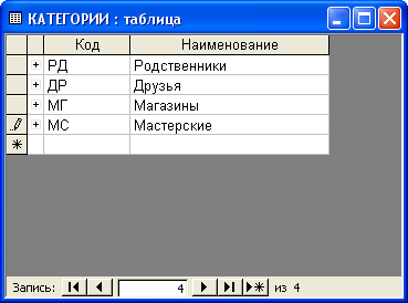 Заполнение нашей базы данных начнем с таблицы "КАТЕГОРИИ", так как данные этой таблицы будут в дальнейшем использоваться при заполнении таблицы "ТЕЛЕФОНЫ". Откройте таблицу "КАТЕГОРИИ". Это можно сделать, дважды щелкнув мышью по значку таблицы в окне "База данных" или выделив этот значок и нажав на кнопку "Открыть" указанного окна. Мышью задайте размеры окна таблицы, а также размеры отдельных полей. Заполните таблицу, как показано на рисунке 8.