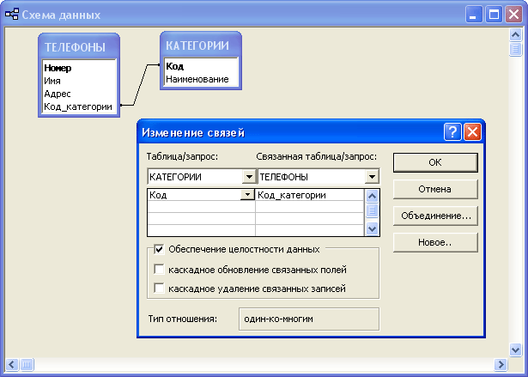 Настроим параметры связи между таблицами. Связь уже была создана (в процессе настройки подстановочного поля), но для обеспечения целостности данных требуется ее дополнительная настройка. Откройте окно "Схема данных" (см. рис. 7). Для этого надо нажать кнопку