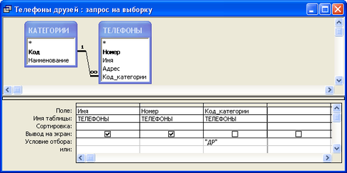 Как и в прошлом запросе, в бланк надо включить поля "Имя", "Номер" и "Код_категории". Однако, настройка свойств поля "Код_категории" теперь другая. Во-первых, добавьте условие отбора (укажите здесь "ДР" - код категории "Друзья"), а во-вторых, уберите флажок "Вывод на экран".