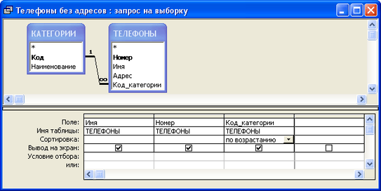Перетащите поля "Имя", "Номер" и "Код_категории" в формируемую таблицу. Укажите также параметр "Сортировка" (по возрастанию) для поля "Код_категории". Это обеспечит группировку отображаемых записей по категориям. Сохраните составленный запрос (назовите, например, "Телефоны без адресов") и закройте бланк запросов по образцу. Чтобы посмотреть результаты работы запроса, откройте его, сделав двойной щелчок по соответствующей записи в окне "База данных".
