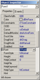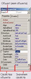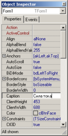 Для изменения значений свойств объектов, в том числе и формы, используется вкладка Properties (Свойства) диалогового окна Object Inspector. В левой колонке этой вкладки перечислены свойства выбранного объекта, в правой - указаны значения свойств.