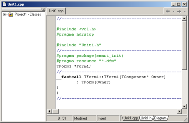 В окне редактора кода (рис.5), которое можно увидеть, отодвинув в сторону окно формы, следует набирать текст программы. В начале работы над новым проектом окно редактора кода содержит сформированный C++ Builder шаблон программы.