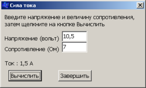 Для демонстрации возможностей C++ Builder и технологии визуального проектирования и событийного программирования займемся разработкой программы, используя которую можно вычислить силу тока в электрической цепи. Сила тока вычисляется по известной формуле: I = U/R, где U — напряжение источника (вольт); R — величина сопротивления (Ом). Вид диалогового окна программы во время ее работы (после щелчка на кнопке Вычислить) приведен на рис. 6.