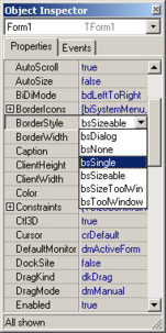 | BorderStyle | Вид границы. Граница может быть обычной (bssizeable), тонкой (bsSingle) или отсутствовать (bsNone). Если у окна обычная граница, то во время работы программы пользователь может при помощи мыши изменить размер окна. Изменить размер окна с тонкой границей нельзя. Если граница отсутствует, то на экран во время работы программы будет выведено окно без заголовка. Положение и размер такого окна во время работы программы изменить нельзя |