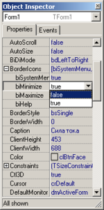 | Borderlcons | Кнопки управления окном. Значение свойства определяет, какие кнопки управления окном будут доступны пользователю во время работы программы. Значение свойства задается путем присвоения значений уточняющим свойствам biSystemMenu, biMinimaze, biMaximaze и biHelp. Свойство biSystemMenu определяет доступность кнопки Свернуть и кнопки системного меню, biMinimaze — кнопки Свернуть, biMaximaze— кнопки Развернуть, biHelp — кнопки вывода справочной информации |