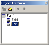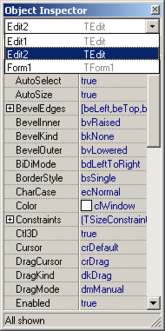 На рис. 12 приведен вид формы после добавления двух полей редактирования. Один из компонентов выбран (выделен), окружен восемью маленькими квадратиками. Свойства выбранного компонента отображаются в окне Object Inspector. Чтобы увидеть и, если надо, изменить свойства другого компонента, надо этот компонент выбрать, щелкнув левой кнопкой мыши на изображении компонента, или выбрать имя компонента в раскрывающемся списке, который находится в верхней части окна Object Inspector (рис. 13). Компонент, свойства которого надо увидеть или изменить, можно выбрать и в окне Object TreeView (рис. 14).