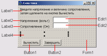 В форму разрабатываемого приложения надо добавить четыре компонента Label. Поле Label1 предназначено для вывода информационного сообщения, поля Label2 и Labels — для вывода информации о назначении полей ввода, поле Label4 — для вывода результата расчета (величины тока в цепи). После добавления компонентов надо выполнить их настройку — установить значения свойств (табл. 6). Прочерк в таблице означает, что значение свойства оставлено без изменения или установлено автоматически — например, как результат изменения другого свойства. В результате форма разрабатываемого приложения должна выглядеть так, как показано на рис. 19.